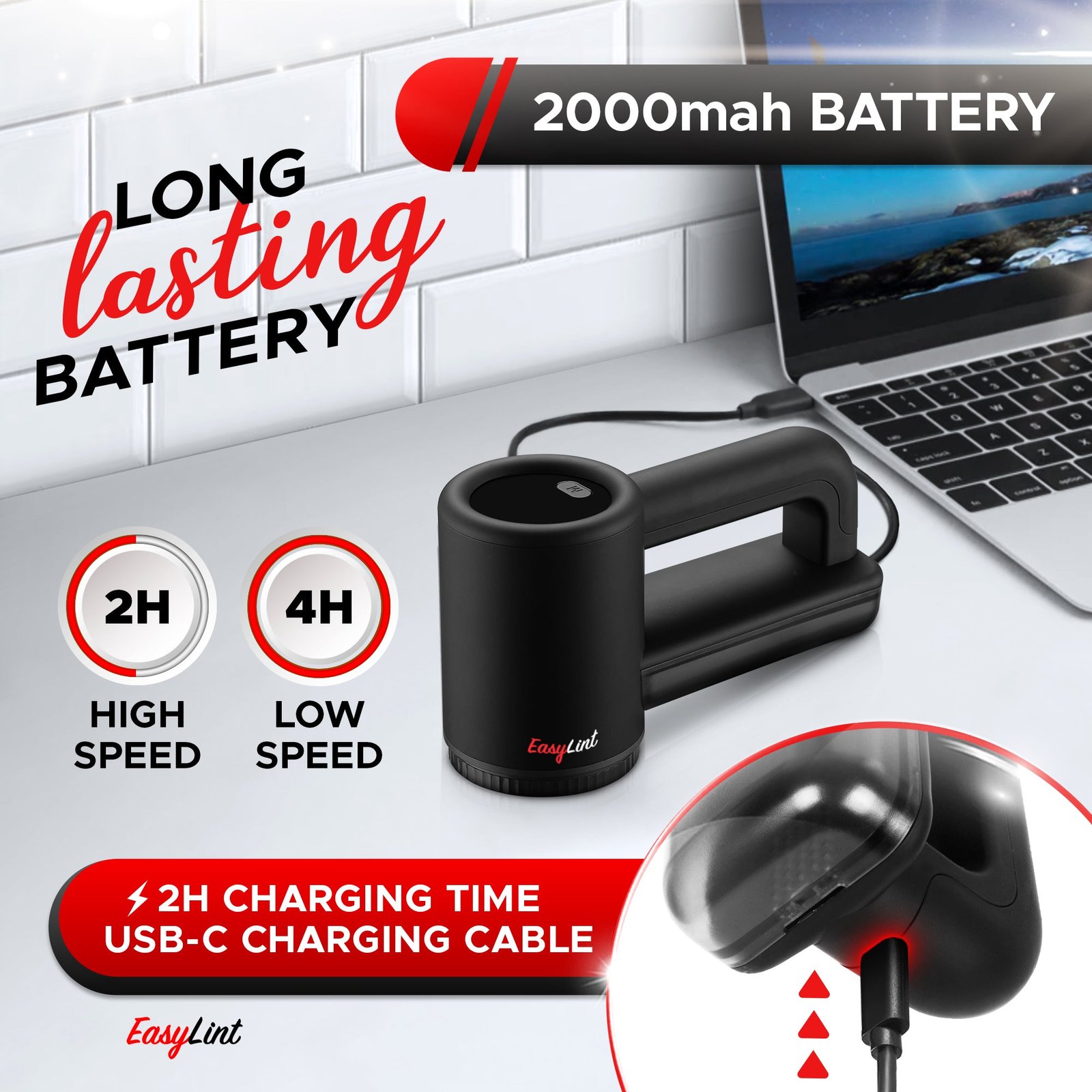 - [FAST CHARGING LITHIUM-ION BATTERY] With a built-in 2000mah reachable lithium-ion battery, our lint remover can be used up to 120-180 minutes of continuous use. Charging is easy with a USB-C adapter plugged into your computer or an adapter of your choice and only needs 2 hours to be fully charged. Charge cable included for use with power banks, computers and laptops.